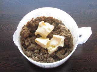 Rozmixovaný základ na paštiku okořeňte staročeským kořením, solí a pepřem a současně přilijte koňak se smetanou pokojové teploty. Staročeské koření lze zakoupit jako hotovou směs v sáčku, nebo si ho můžete připravit doma smícháním soli, majoránky, mletého kmínu, pepře, bobkového listu, sladké papriky, nového koření, muškátového květu a zázvoru.
